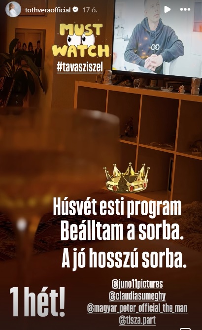 Tóth Vera az Instagramon osztott meg egy sztorit arról, hogy megnézte a Tavaszi Szél című, Magyar Péterről szóló filmet – szúrta ki a 444.hu.