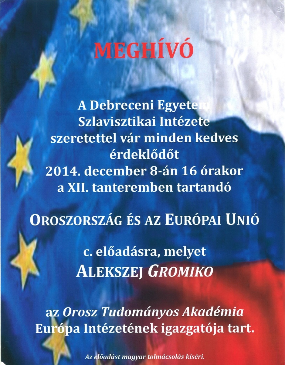 A Debreceni Egyetem Szlavisztikai Intézete szeretettel vár minden kedves érdeklődőt 2014. december 8-án 16 órakor a XII. tanteremben tartandó Oroszország és az Európai Unió c. előadásra, melyet Alekszej Gromiko, az Orosz Tudományos Akadémia Európai Intézetének igazgatója tart.