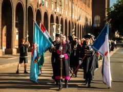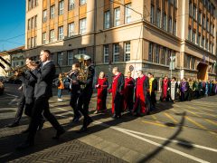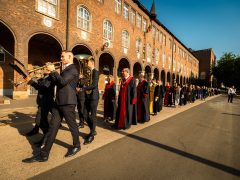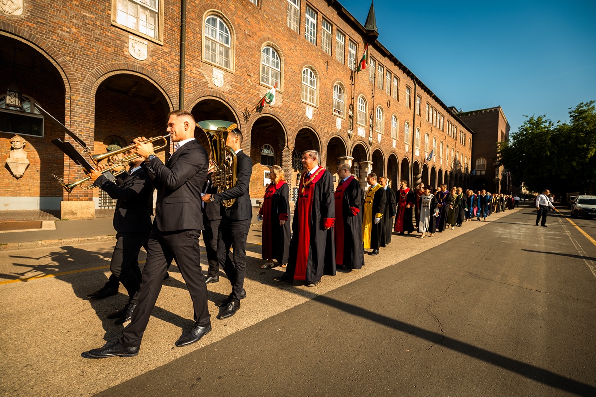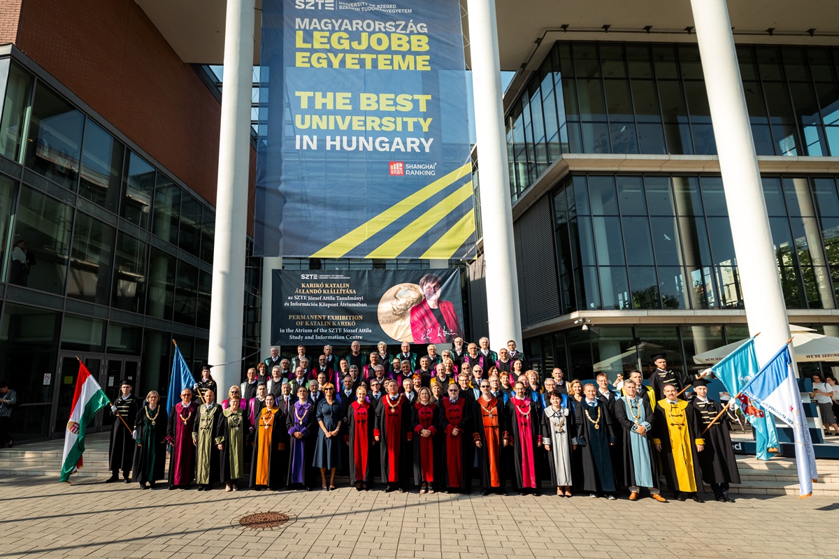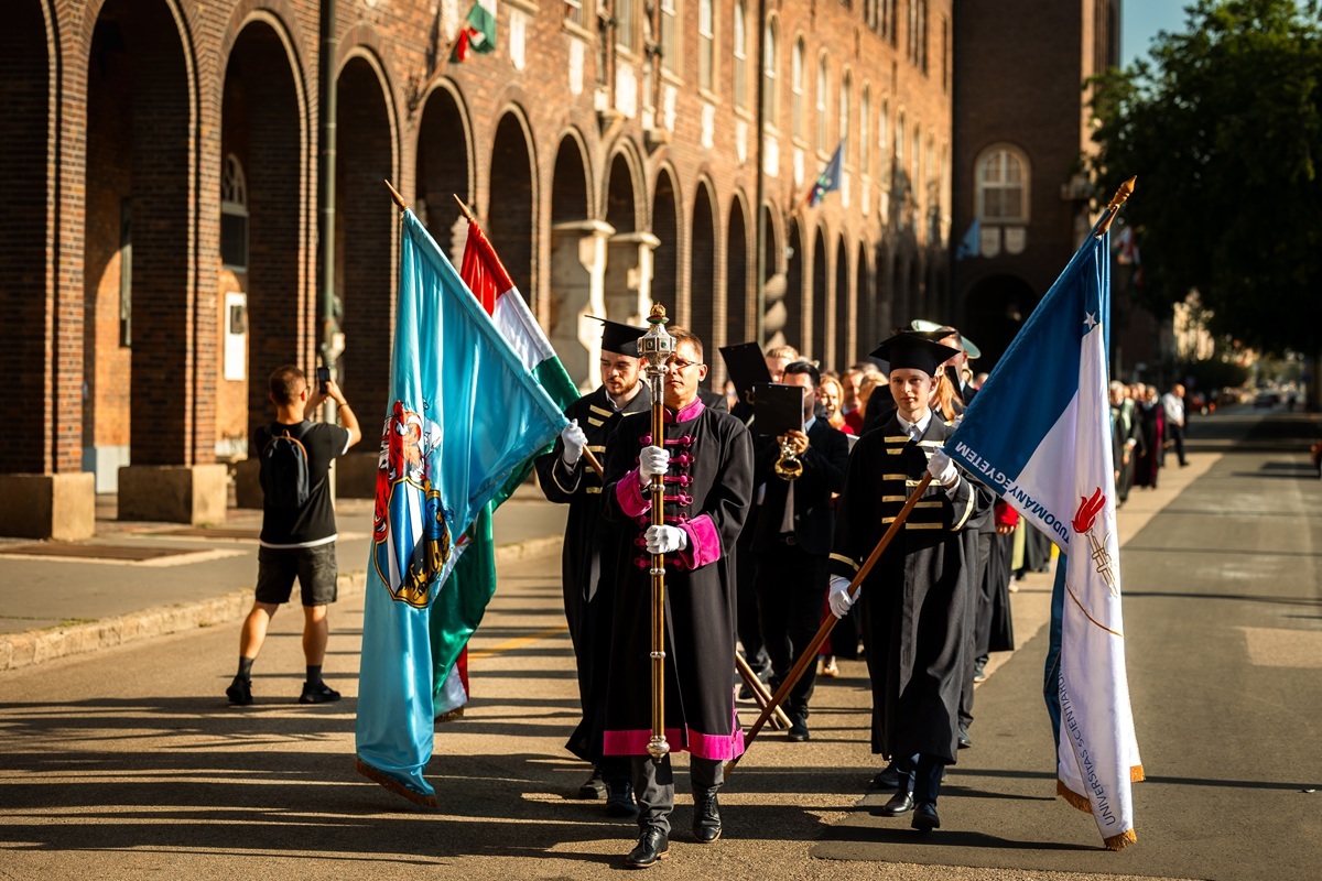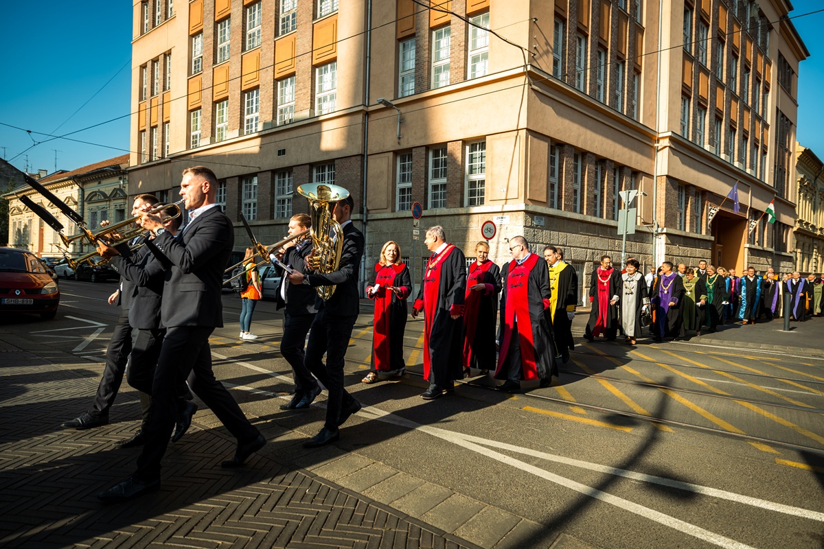 A professzori kar számos egyetemi épületet érintő menetével kezdődött meg szeptember 5-én, pénteken a Szegedi Tudományegyetem tanévnyitó ünnepsége. A taláros testület idén a Dugonics téri rektori hivataltól indulva új, bővített útvonalon haladt a József Attila Tanulmányi és Információs Központig (TIK). Szintén újdonság, hogy az egyetemi, az európai, a magyar és a városi zászlókkal az élen haladó professzorokat ezúttal fúvószenészek is kísérték. A testületről csoportkép készült a TIK előtt.