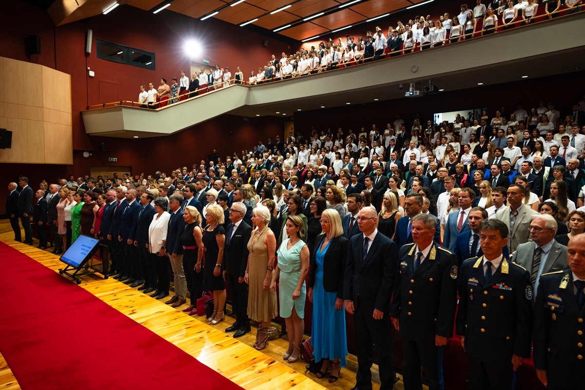 Délelőtt 10 órakor az egyetemi hajdú koppantása jelezte az ünnepi szenátusi ülés kezdetét az akkorra már teljesen megtelt kongresszusi teremben. Az esemény díszvendége Lantos Csaba energiaügyi miniszter volt, aki a főasztalnál foglalt helyet Prof. Dr. Rovó László rektorral, Prof. Dr. Szabó Gáborral, a Szegedi Tudományegyetemért Alapítvány kuratóriumi elnökével, Dr. Fendler Judit kancellárral, valamint Kiss-Rigó László szeged-csanádi püspökkel együtt.