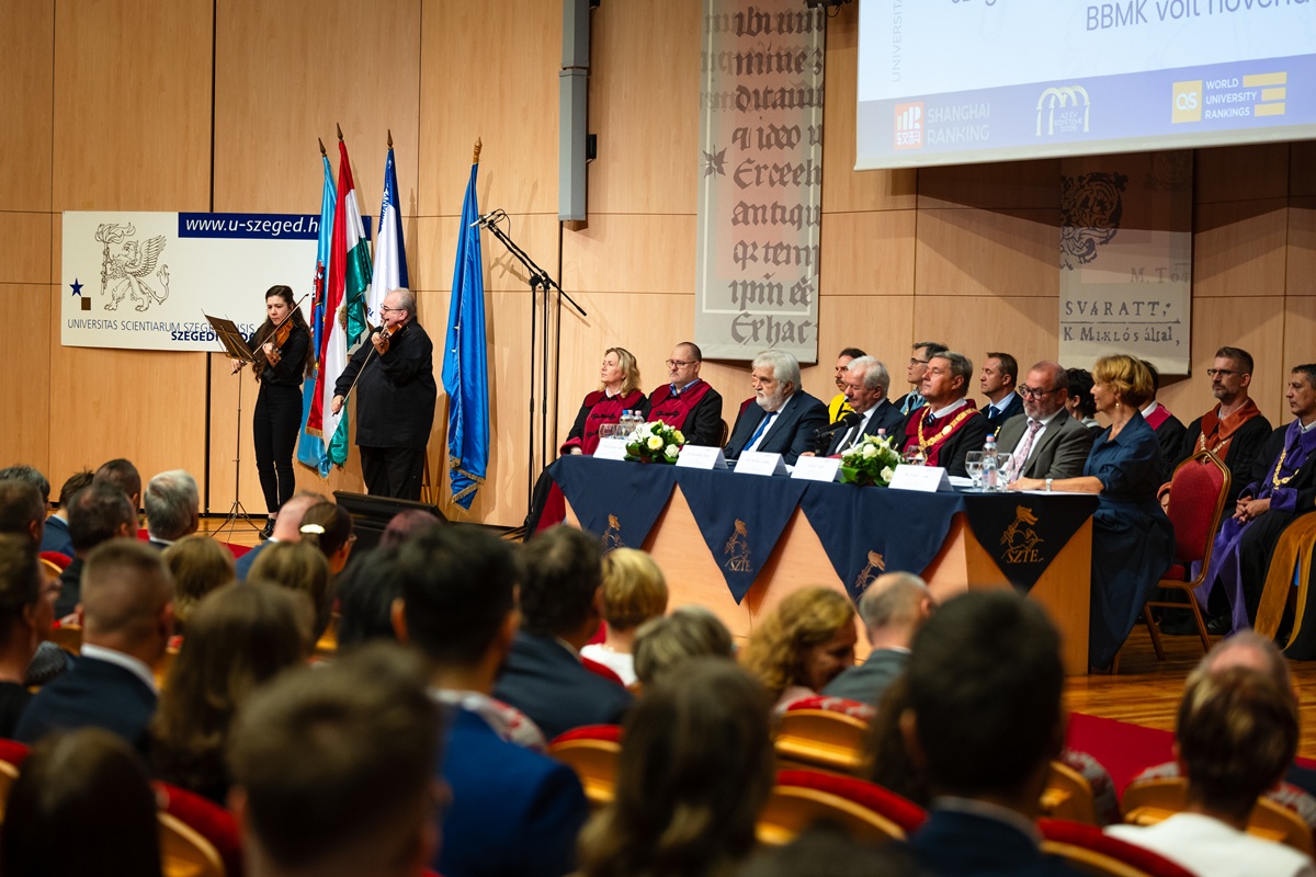 Fúvósok kíséretében vonult végig Szeged belvárosán a professzori kar, ezzel kezdődött pénteken a Szegedi Tudományegyetem tanévnyitó ünnepsége. A TIK-ben tartott szenátusi ülésen rangos elismeréseket adtak át, és nemzetközi együttműködésekről is beszámolt az egyetem rektora. Az esemény díszvendége Lantos Csaba energiaügyi miniszter volt. A hagyományok szerint az elsőéves hallgatók esküt tettek, majd a rektor kézfogásával váltak az universitas polgáraivá.