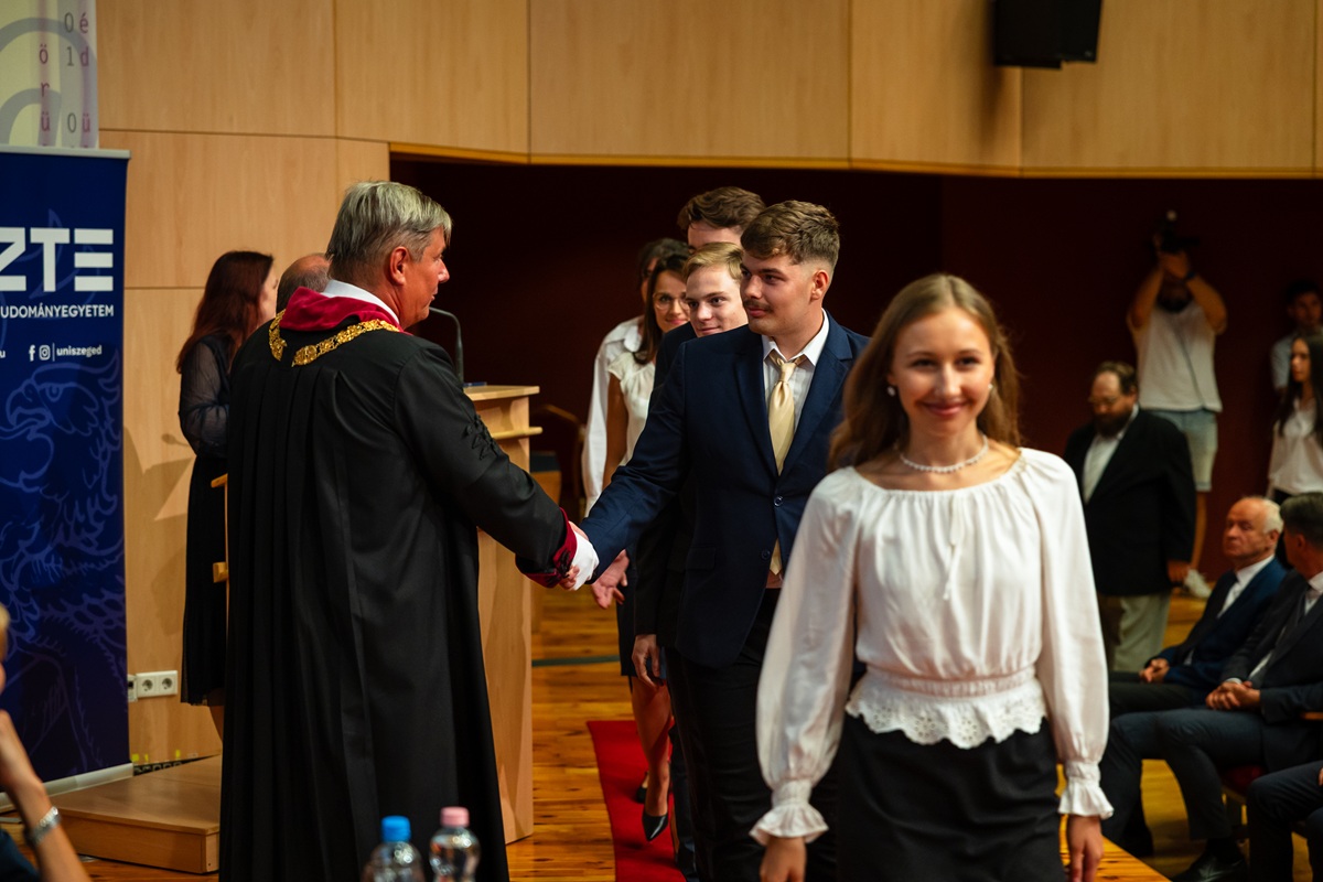 A hagyományok szerint a 2025-2026-os egyetemi tanévet megnyitó eseményen esküt tettek az elsőéves hallgatók a Szenátus és a professzori kar előtt. A hallgatói eskü szövegét Kádár Anna, az Állam- és Jogtudományi Kar elsőéves hallgatója, valamint Nagy Kristóf Tamás, a Szent-Györgyi Albert Orvostudományi Kar elsőéves hallgatója mondta el. Az egyetemi tanulmányaikat most kezdő fiatalokat a rektor kézfogásával egyetemi polgárrá fogadta.