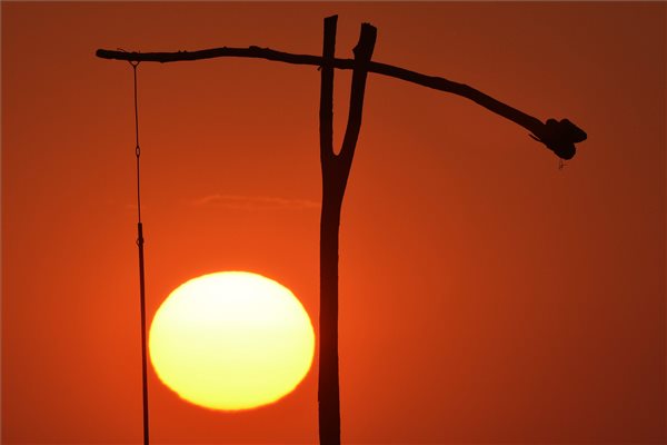 Gémeskút a felkelő Nap előtt a Hortobágyon, Nagyhegyes térségéből fotózva 2015. július 17-én. MTI Fotó: Czeglédi Zsolt