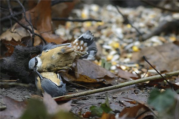 Két csuszka (Sitta europaea) viaskodik egy madáretetőnél a debreceni Nagyerdőben 2015. december 28-án. Nagyerdő Csirip névvel közösségi madáretetési programot indított el decemberben a Terepszemle Stúdió természetvédelmi egyesület. A szervezet szeretné a város lakóit bevonni a madáretetési tevékenységbe, arra buzdítanak mindenkit, hogy járjanak ki eleséggel feltölteni az etetőket, vagy végezzenek madármegfigyelést a téli hónapokban. MTI Fotó: Czeglédi Zsolt