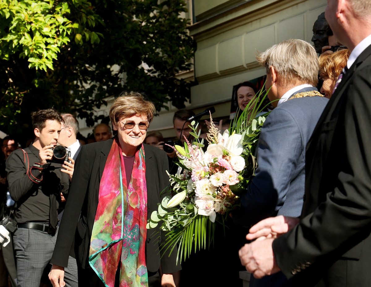 Karikó Katalin 19 órakor a JATE Klubtól ünnepi sétára indult a Dóm térre.