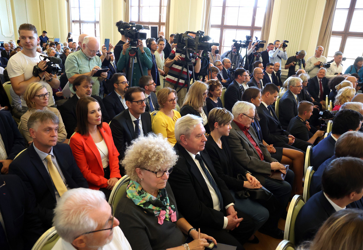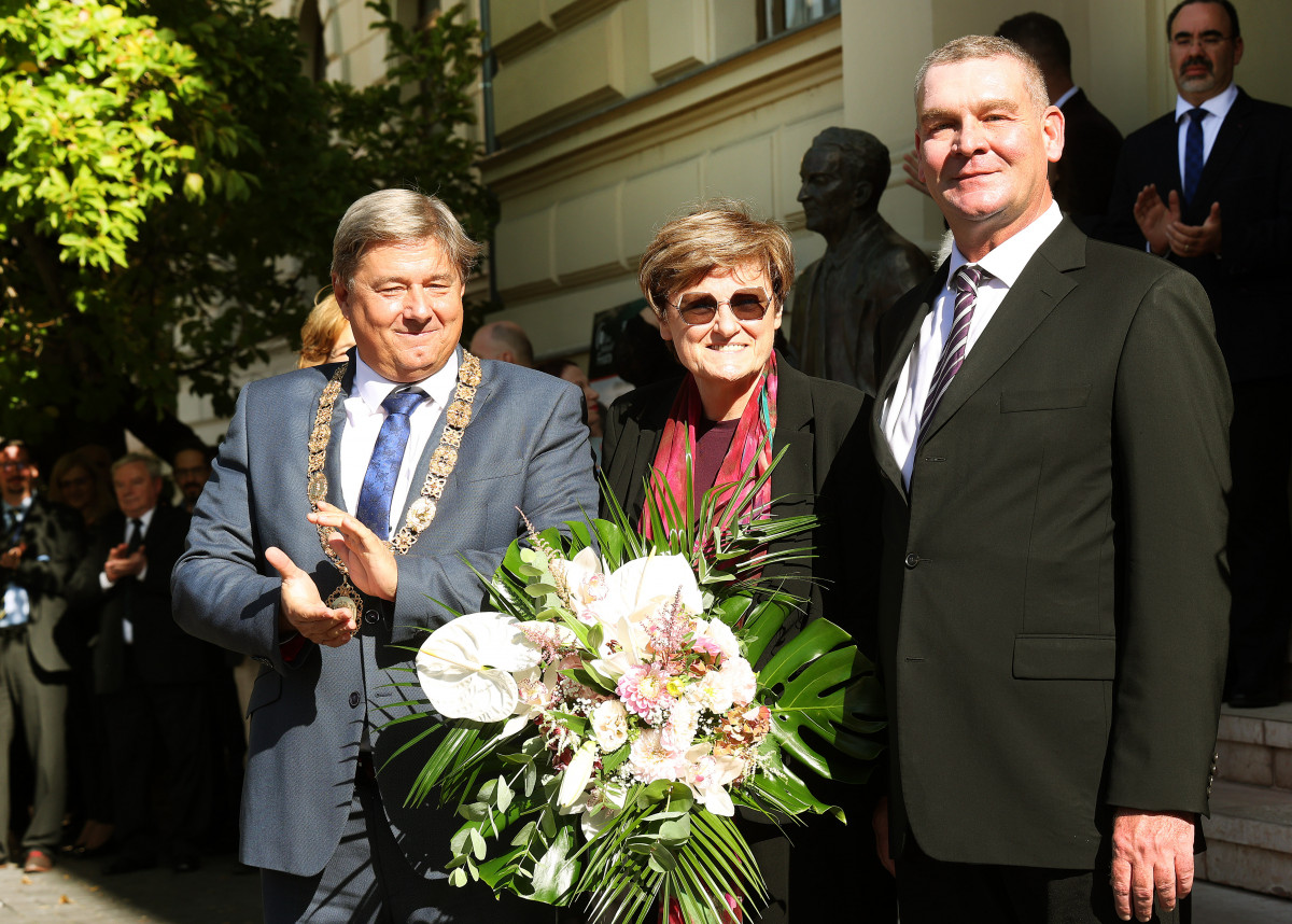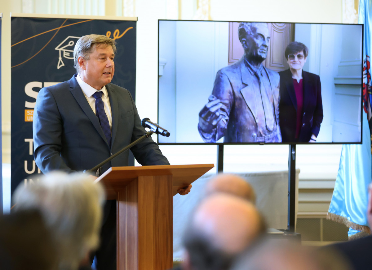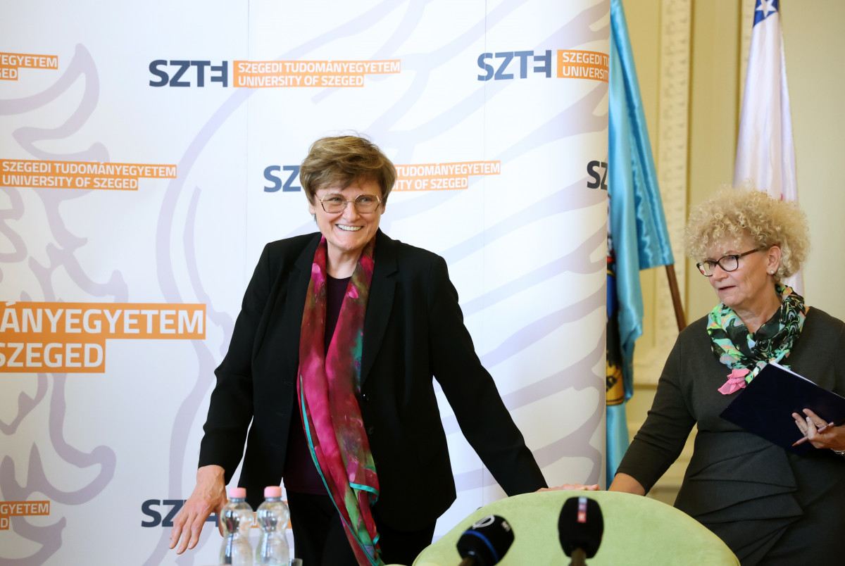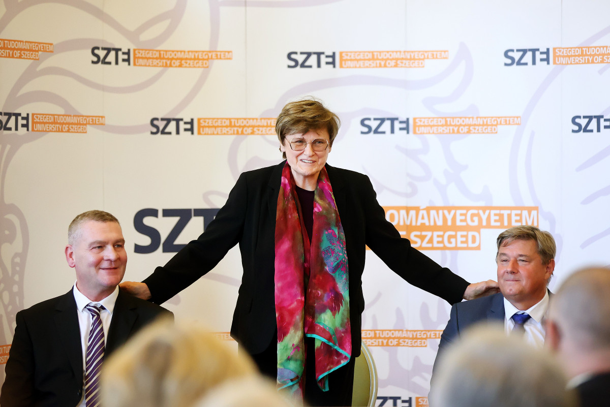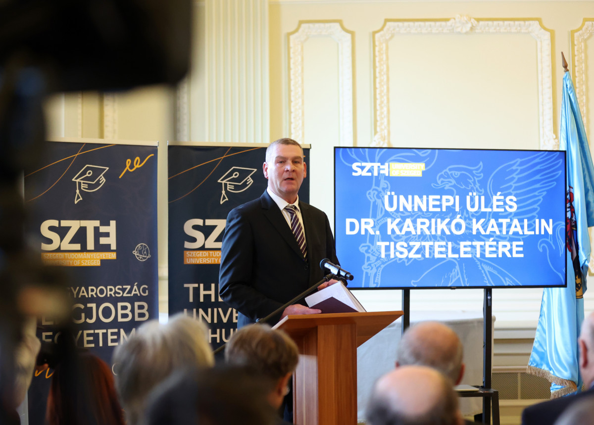 A Dugonics téri épületben 14 órakor ünnepi ülés kezdődött Dr. Karikó Katalin tiszteletére. A rektori hivatal dísztermében a meghívott vendégek felállva, vastapssal köszöntötték a tudóst.