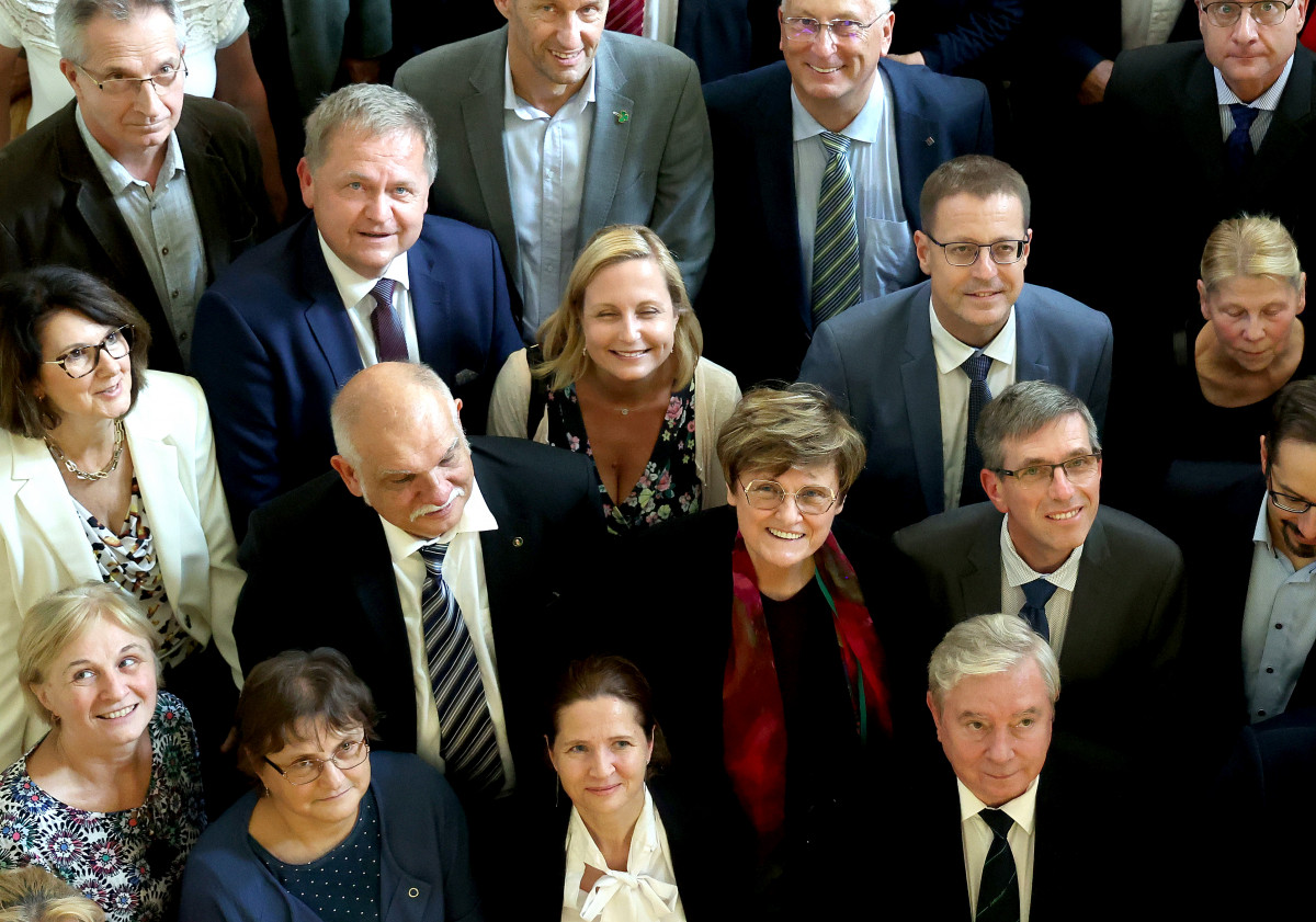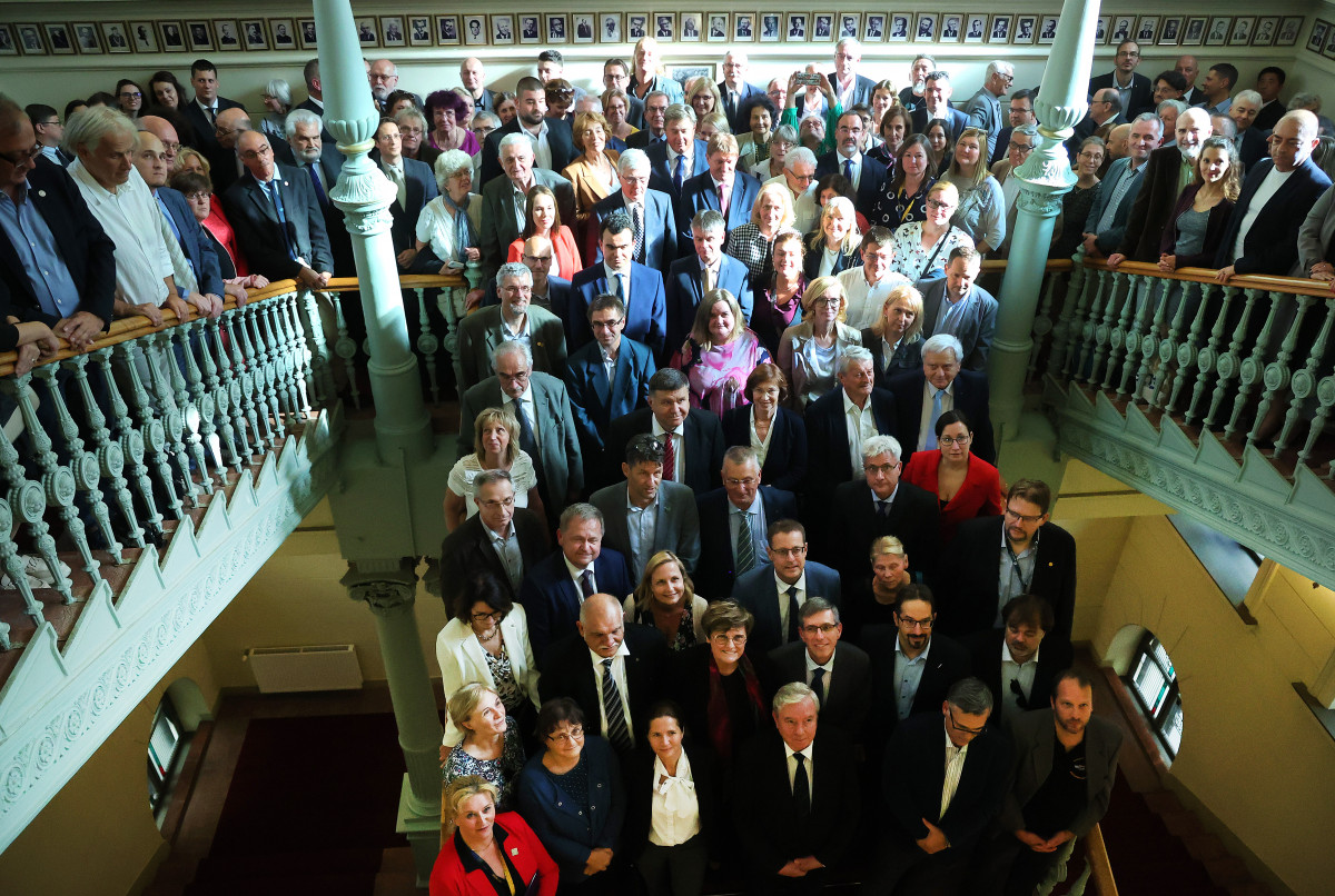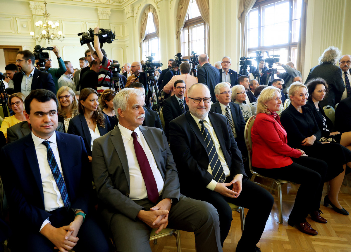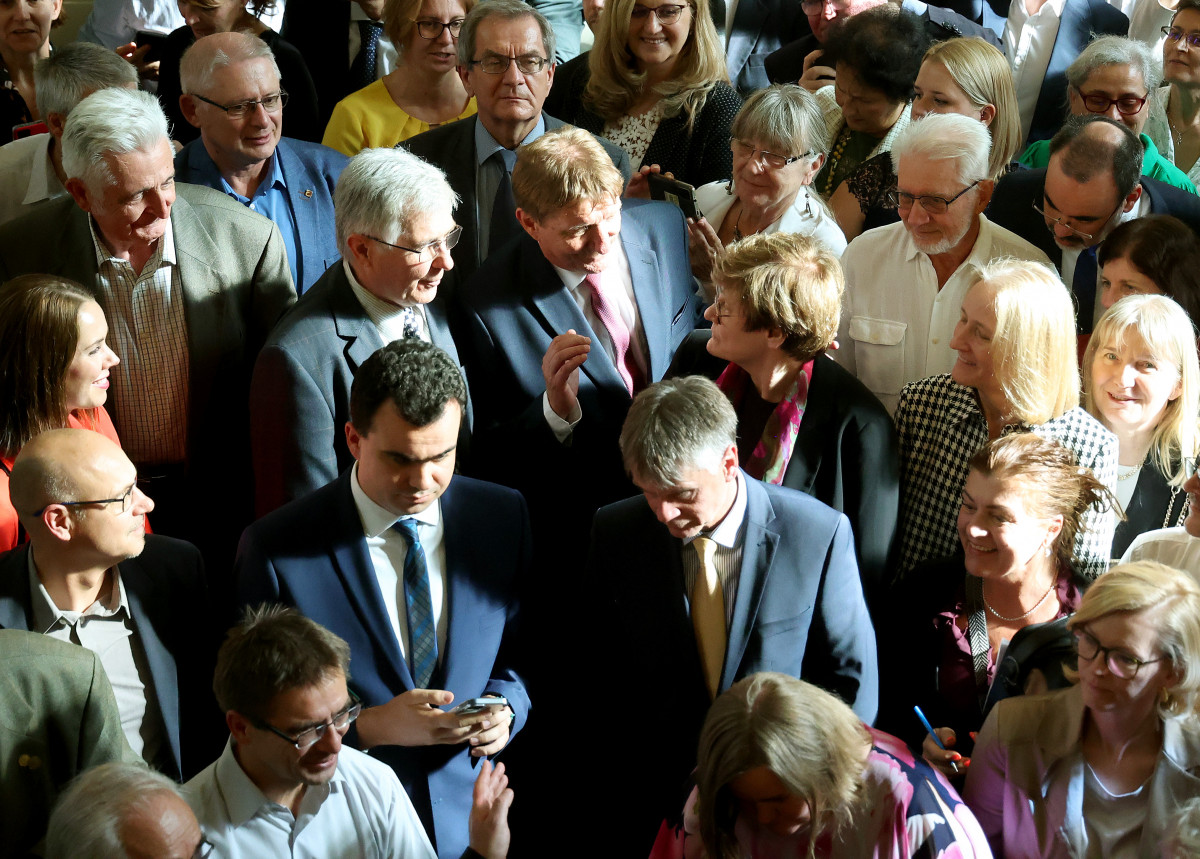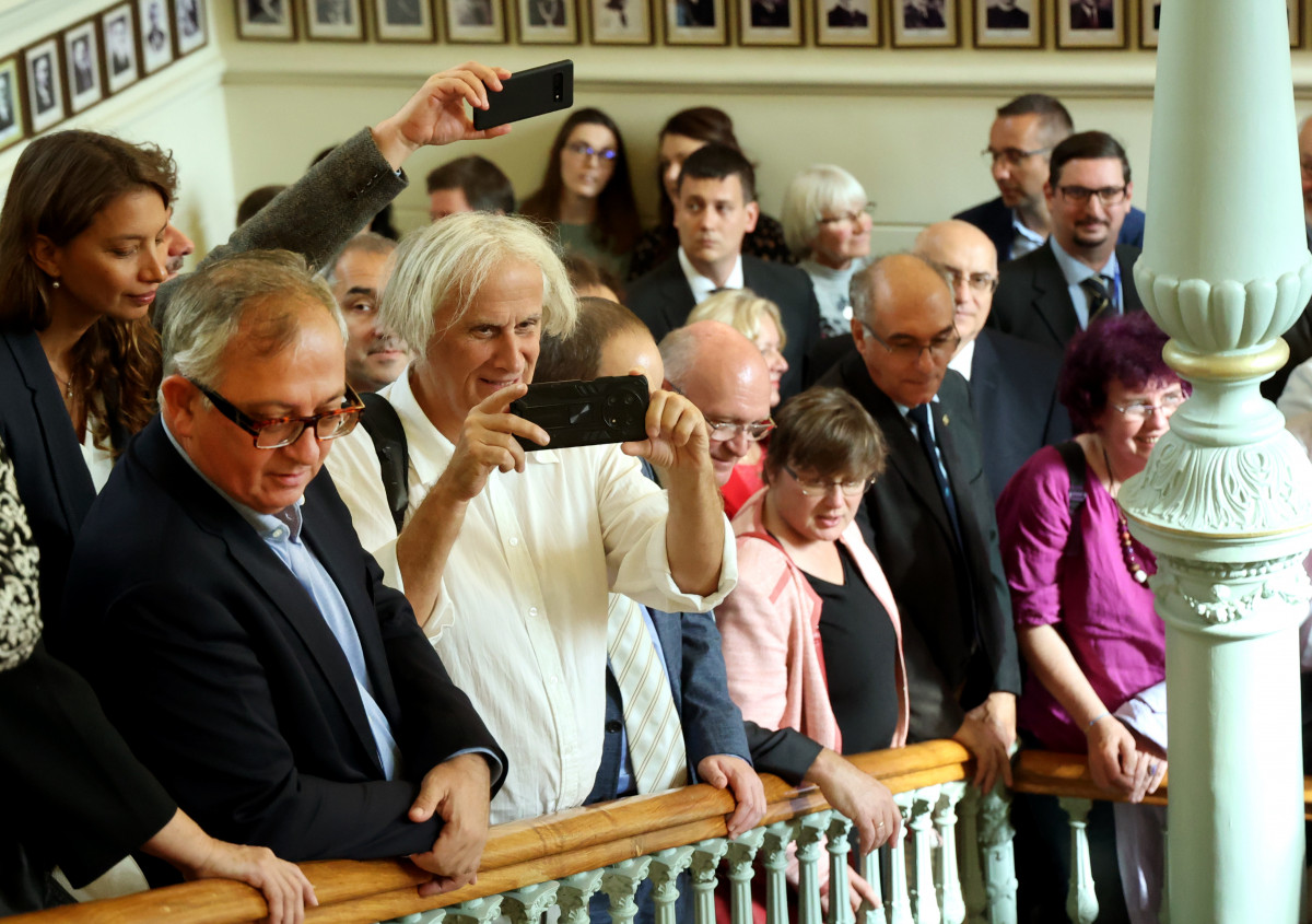 A Dugonics téri épületben 14 órakor ünnepi ülés kezdődött Dr. Karikó Katalin tiszteletére. A rektori hivatal dísztermében a meghívott vendégek felállva, vastapssal köszöntötték a tudóst.