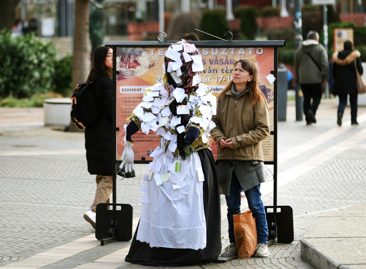 A felnőtteknek pedig a tűzre dobott kiszebábra volt lehetőségük ráaggatni minden olyan bajt, bút, bánatot, amelyet el szerettek volna engedi a tavasz közeledtével. A báb előbb néhány napot a Mars téren, majd a hét hátralévő részét a Dugonics téren töltötte, ahol nap, mint nap újabb és újabb cetlivel lett gazdagabb.