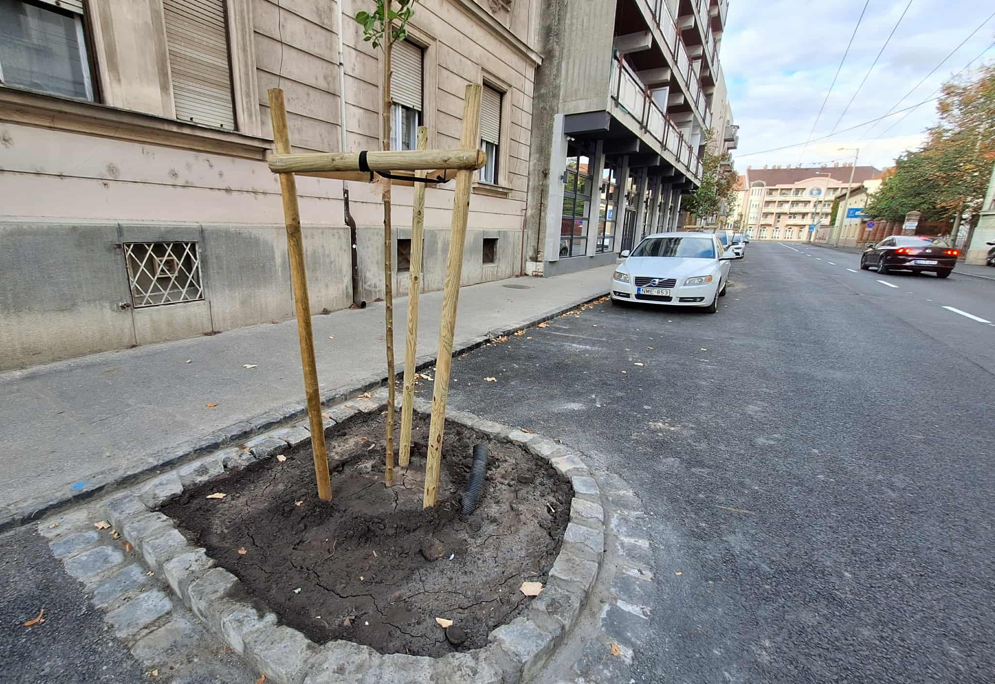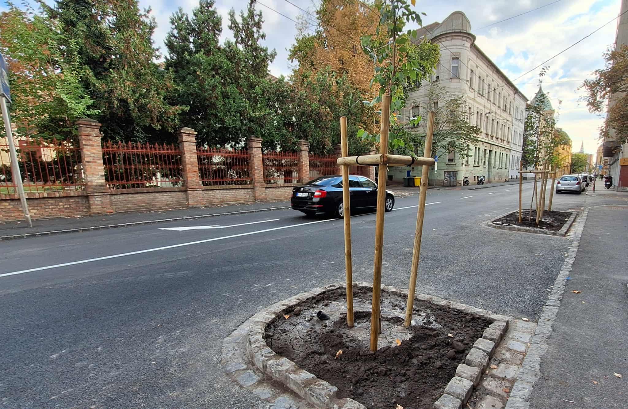 Szeged, Dózsa György utca, fásítás, fa, fák, zöld sziget