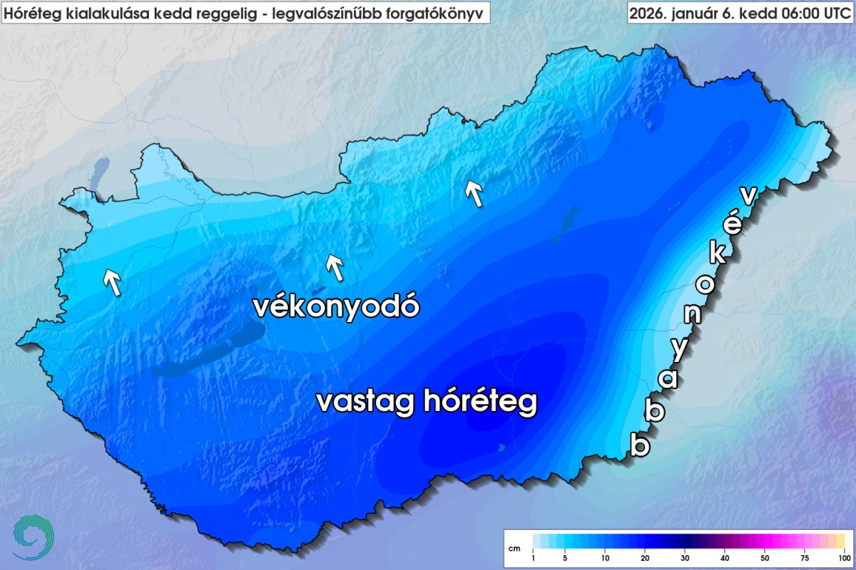 a déli országrészben a legjobbak az esélyek vastagabb hótakaróra, itt nagyobb területen 10 cm körüli vagy azt meghaladó hó is összegyűlhet, míg észak felé haladva csökkenő mennyiségek valószínűek.