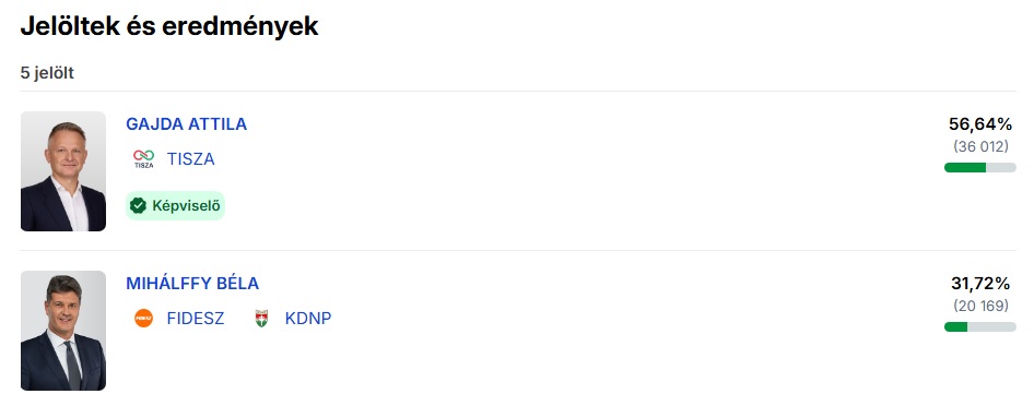 Majdnem 25 százalékponttal kapott ki a 2026-os országgyűlési választáson a tiszás Gajda Attilától Mihálffy Béla fideszes országgyűlési képviselő Csongrád-Csanád megye 2. számú választókerületében.