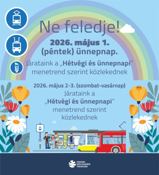 Május 1-je és 3-a között az SZKT járatai “Hétvégi és ünnepnapi” menetrend szerint közlekednek.