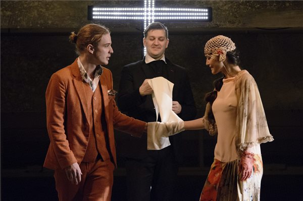 Vecsei Miklós (b) Rómeó, Mészáros Tibor (k) Lőrinc barát és Szakács Hajnalka (j) Júlia szerepében William Shakespeare Rómeó és Júlia című tragédiája próbáján a debreceni Csokonai Nemzeti Színházban 2016. február 17-én. A színdarabot február 19-én mutatják be Szikszai Rémusz rendezésében. MTI Fotó: Czeglédi Zsolt