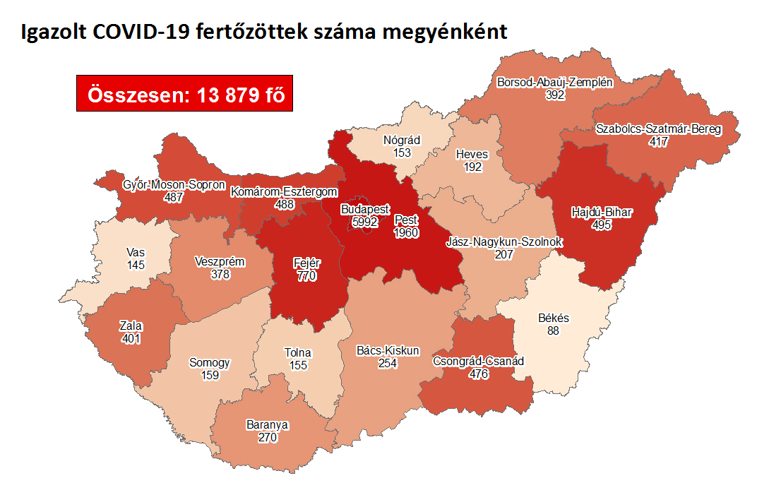 A kormányzati portálon azt írták: 13 879-re nőtt a Magyarországon azonosított fertőzöttek száma. Az elhunytak száma 646-ra emelkedett, 4130-an már meggyógyultak.