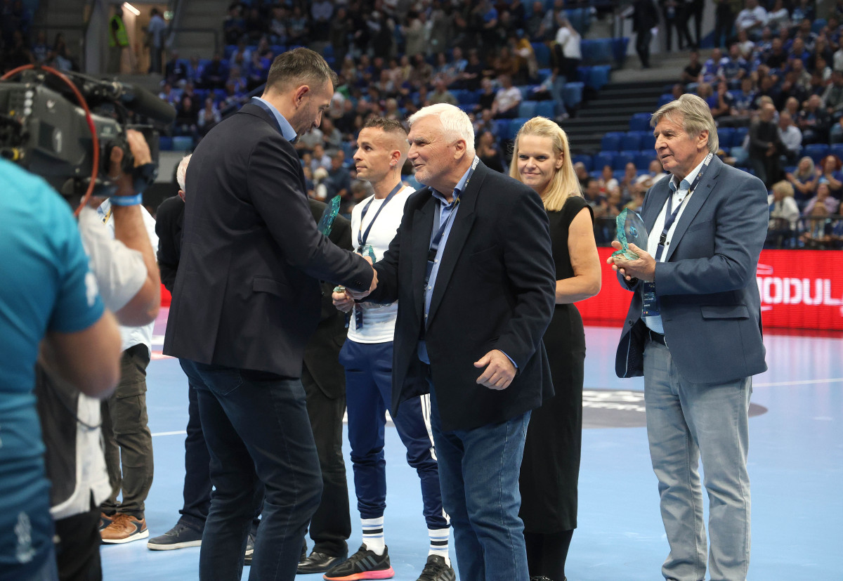 A hazaiak keretéből Janus Dadi Smárason és Magnus Röd, a vendégektől Manuel Zehnder, Matthias Musche és Nikola Portner hiányzott. A kezdés előtt a pályán ünnepélyes keretek között köszöntötték a másodosztályú bajnokságot szinte napra pontosan ötven évvel ezelőtt megnyert Szegedi Volán SC tagjait, akik a klub történetében először feljutottak az élvonalba, ahol azóta megszakítás nélkül szerepelnek. Az elhunytjátékosokat a családtagok képviselték, az ajándékokat pedig Szűcs Ernő Péter klubelnök és Ilyés Ferenc, a Magyar Kézilabda Szövetség elnöke adta át.