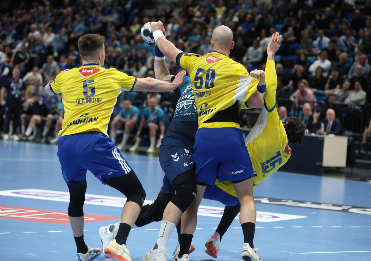 Támadásban és védekezésben is jobban kezdett a Szeged, többször is vezetett két góllal, de a 14. percben egyenlítettek a lengyelek. Mikler Roland bravúrosan védett, támadásban viszont átmenetileg visszaesett a Magyar Kupa címvédője.